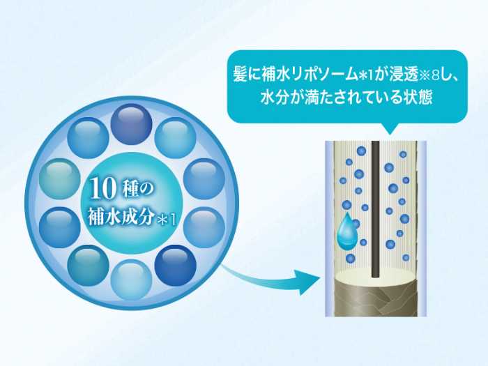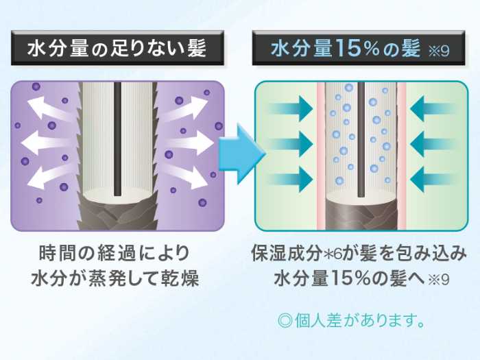 水分のない乾燥した髪へ水分バランスを整える補水+保湿成分が浸透。
