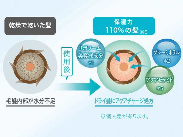 アクアチャージ処方でブルーミネラルとアクアセラミドがドライ髪に浸透し保湿力110%のうるぷる髪へ導きます。