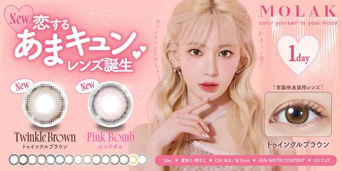 PIAでは、宮脇咲良さんが手掛け、イメージモデルを務めているカラコンブランド「MOLAK(モラク)」から、1dayシリーズの新色を2025年2月10日(月)より発売いたしております。甘くときめく瞳に仕上げてくれる、新色「トゥインクルブラウン」と「ピンクボム」が1dayシリーズに登場しています。発売記念のキャンペーンも開催中なので、ぜひこの機会にチェックしてみてください。