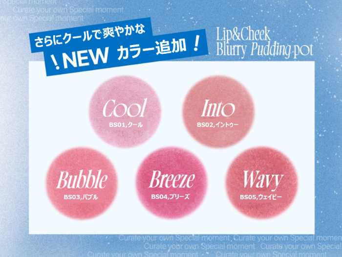 韓国釜山をモチーフにした新カラーラインアップ「フィー リップアンドチーク ブラーリープリンポット ブルー」は、ブラーリープリンテクスチャーが癖になると話題のアイテム。