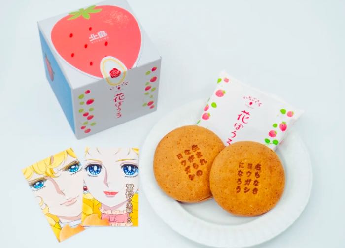 さらに「ベルサイユのさが」では他にも、コラボで生まれたべつばらスイーツが。佐賀の老舗お菓子屋さん 「丸芳露本舗 北島」からは、特製の「いちごさんジャム」をサンドした「花ぼうろ いちごさん」に「ベルばら」の名セリフをオマージュした焼印が刻まれた特別バージョンが発売中。オスカルまたはマリー・アントワネットが描かれた限定カードも入っています♡こちらはオンラインでも購入できますから、老舗の味わいと「ベルばら」のコラボを気軽に楽しめそうです。