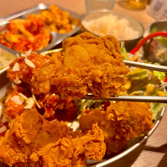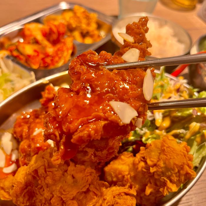 ヤンニョムチキンは、甘さの後にピリ辛が追いかけてくるクセになる美味しさ。