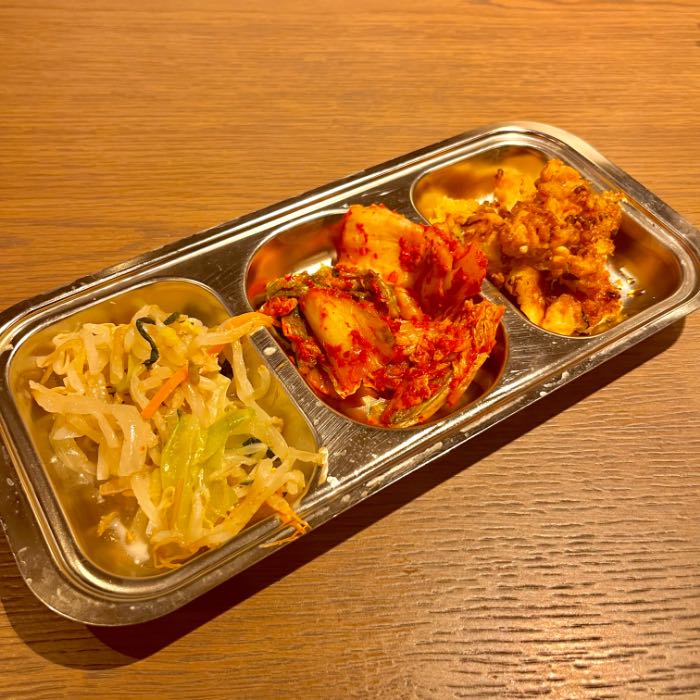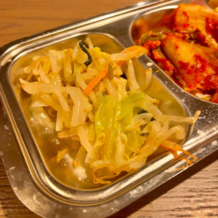チヂミは一口サイズにカットされて食べやすく、もやしキャベツのナムルも程良い味付け。