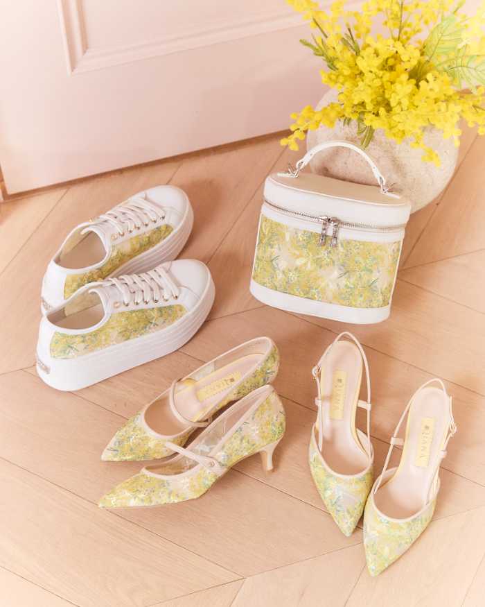 第三弾では3月8日の「国際女性デー」に合わせてミモザブーケをモチーフにしたシューズ3モデル、バッグ1モデルをラインアップ。