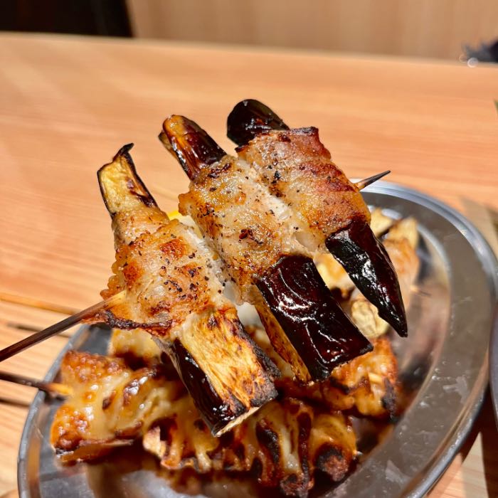 続いては博多仕込みの串焼きメニューから、豚肉で野菜を巻いた野菜巻き串と焼き鳥を注文!