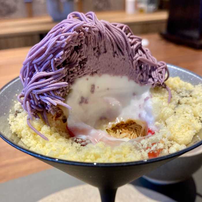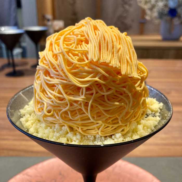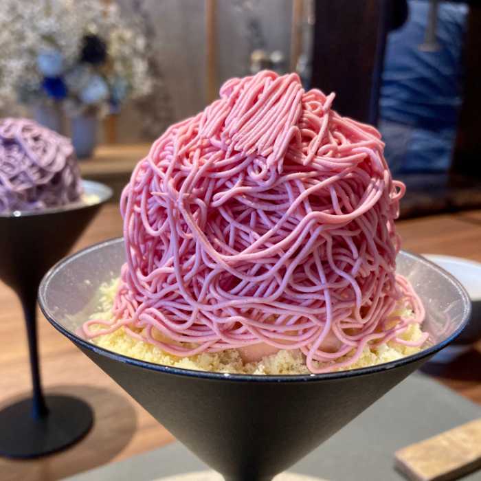 ガナッシュモンテとは空気を含ませた軽やかなチョコレートベースのクリーム。このクリームに10種類のフレーバーを付けて特製の絞り機で糸のように絞り出します。「紅糸(苺)」「翠糸(抹茶)」「薄墨糸(黒ゴマ)」などとネーミングされておりメニューを見ながら選ぶ楽しさも演出。