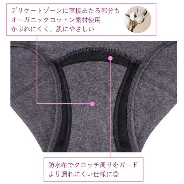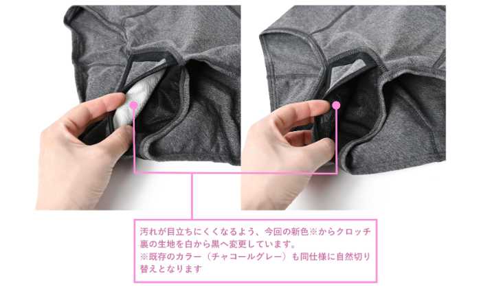 たっぷり約45㏄の吸水が可能で、防水布でぐるりと囲うことで染み出しを防止しています。汚れが目立たないように、クロッチ裏の生地を白から黒へ変更しました。