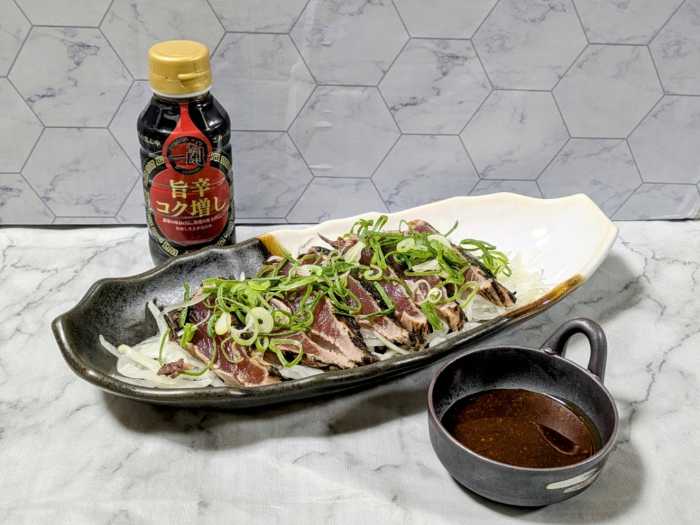 今回は、カツオのタタキのタレに使ってみました。意外な組み合わせに思いますが、とっても合うんです!他には、餃子・焼肉のタレとして使ってみるのもおすすめです。