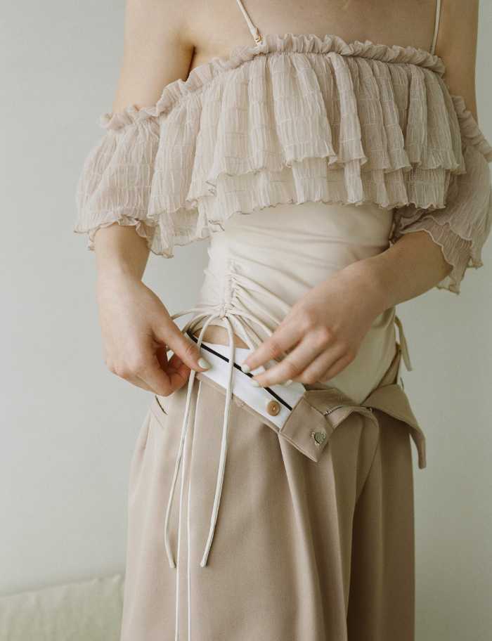 ワンピースとラッシュガードがセットになったアイテムや、ウエストリボンがキュートなビキニとショートパンツのセット、フリルがシックなワンピースタイプなどがラインアップ。