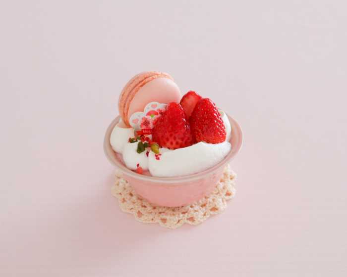 ピンク色のマカロンを飾った、1人用のカップデザートです。甘酸っぱいいちごのムースを使っています。
