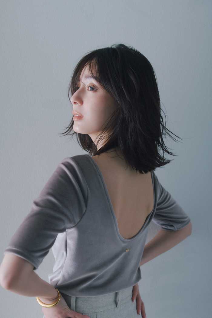 背面が大胆に開いたトップスは、ヘルシーな肌見せが叶うアイテム。上品な光沢で高級感があり、さまざまなアイテムと合わせて着回しができそうですね。