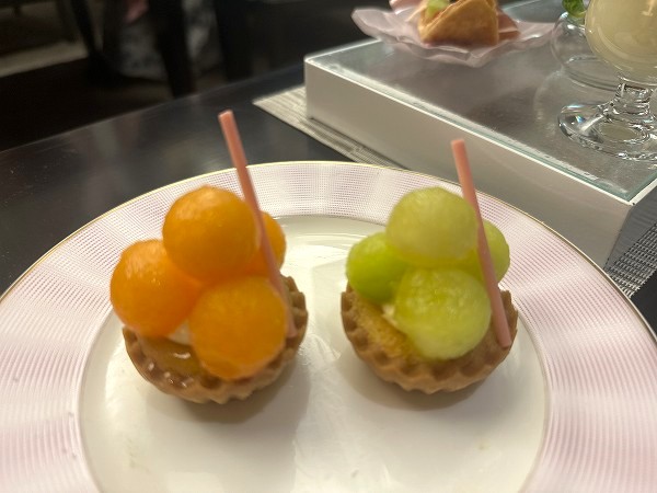 タルトの上に飾られた赤肉メロンは「濃厚でジューシーなご褒美スイーツ」、青肉メロンは「爽やかで上品な味わいのスイーツ」。それぞれの味の違いがはっきりと感じられ、食べ比べで感じた楽しさも魅力です。