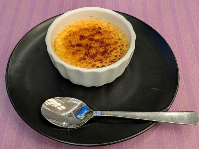 目の前でバーナーで炙って仕上げる「クレーム・ブリュレ」。