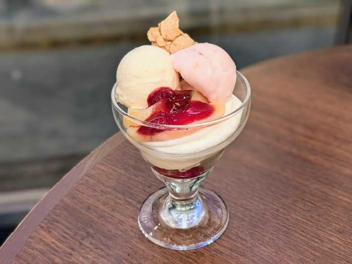 「ピーチメルバ風パフェハーゲンダッツバニラアイスクリーム添え」は、透明のジュレにカスタードクリーム、スポンジ、ホイップクリームを重ね、仕上げにハーゲンダッツバニラアイスクリームとピーチのソルベをトッピング。