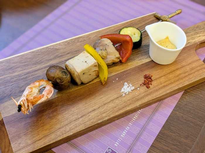 ディナー限定の「鶏肉、豚肉、海老のブロシェット」は、カレー風味のタルタルソースでいただきます。2種類のお肉や海老を串に刺して焼きあげ、見た目もインパクトがあります。