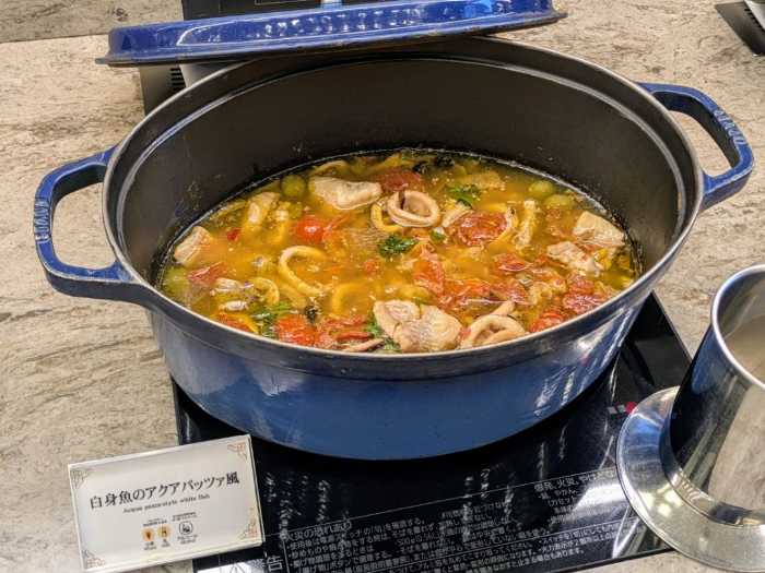 魚介の旨みたっぷりの「白身魚のアクアパッツァ風」。