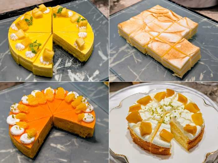 マンゴーやパイナップルをたっぷり使用したケーキは、トロピカル感があり。(写真左上から)「アナナスポム」、「レモンムース」、「マンゴー飾りのショートケーキ」、「マンダリンムース」