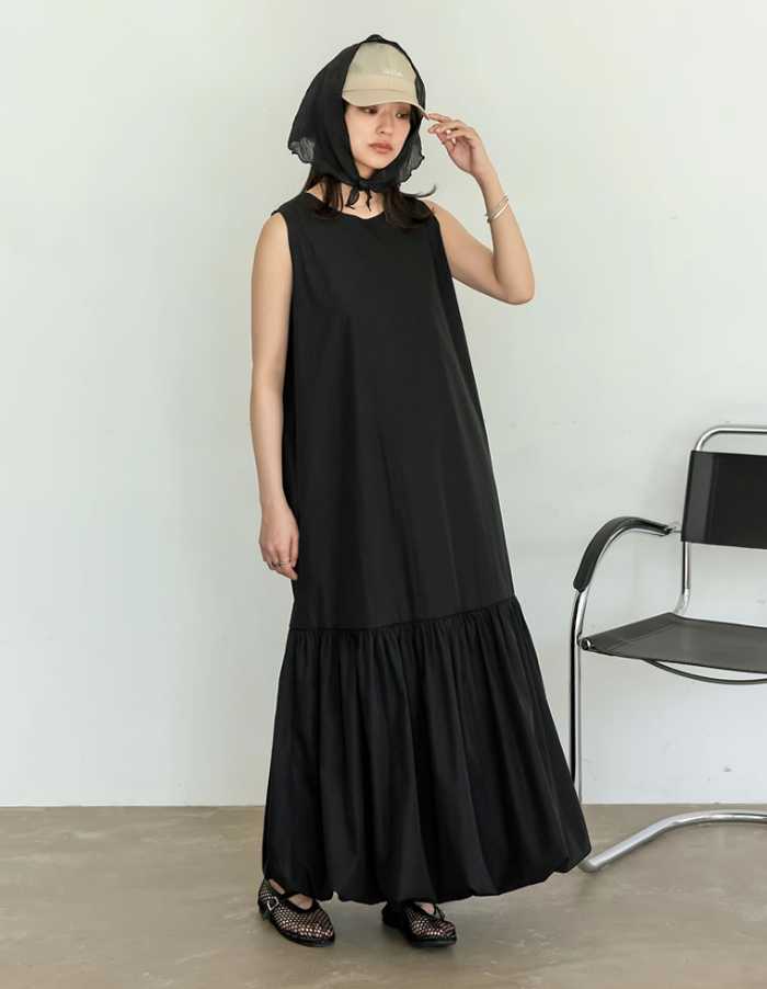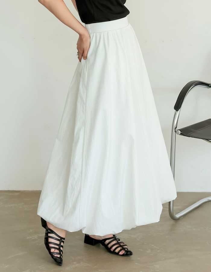 バルーンシルエットがほどよく体形をカバーしながら、フェミニンさを引き立てます。