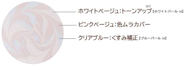 トーンアップをかなえるホワイトベージュ、色のムラをカバーするピンクベージュ、くすみ補正のクリアブルーの3色を絶妙なバランスで配合。