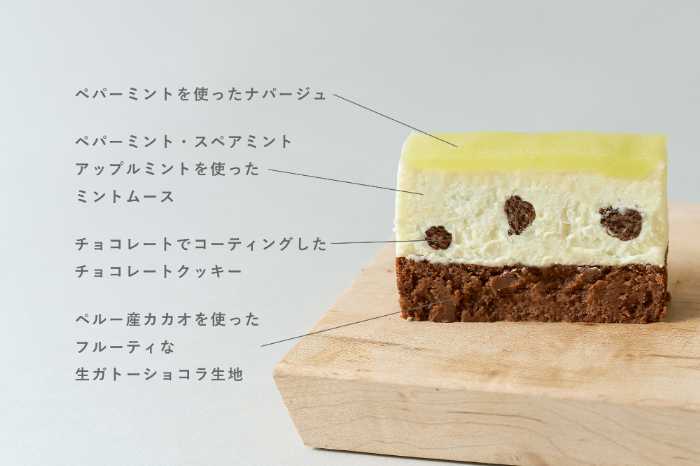 茎と葉を分けて丁寧に抽出した香りは、人工的な香料とは一線を画す爽やかさ。ムースの上には、ペパーミントを使ったゼリーが重なり、口に入れた瞬間にクールな風味が広がります。