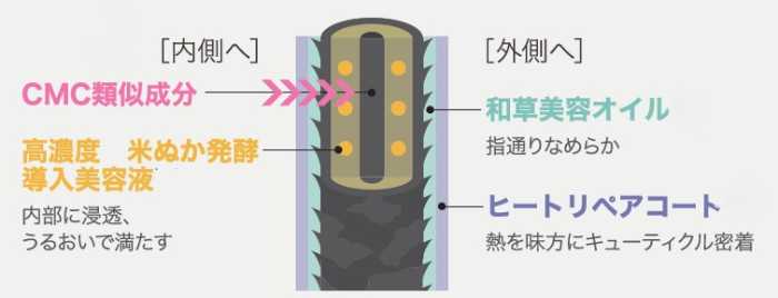 高濃度米ぬか発酵導入美容液とCMC類似成分が髪内部に潤いをチャージし、和草美容オイルとヒートリペアコートでキューティクルまでしっかり密着。