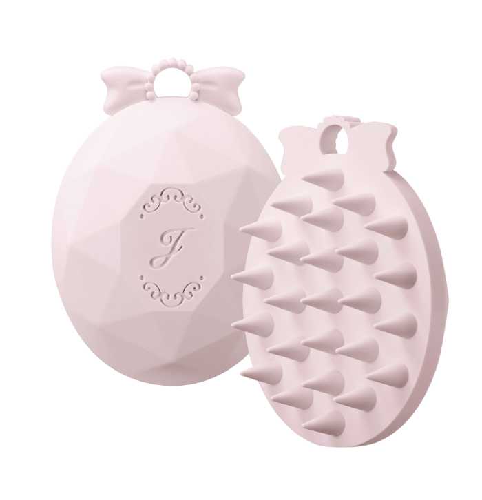 ふんわりリボンがあしらわれたシャンプーブラシは、細毛・多毛どちらでも使いやすく、頭皮までしっかり届く設計。衛生的に保管できるフック穴付きで、見た目も機能性も◎。