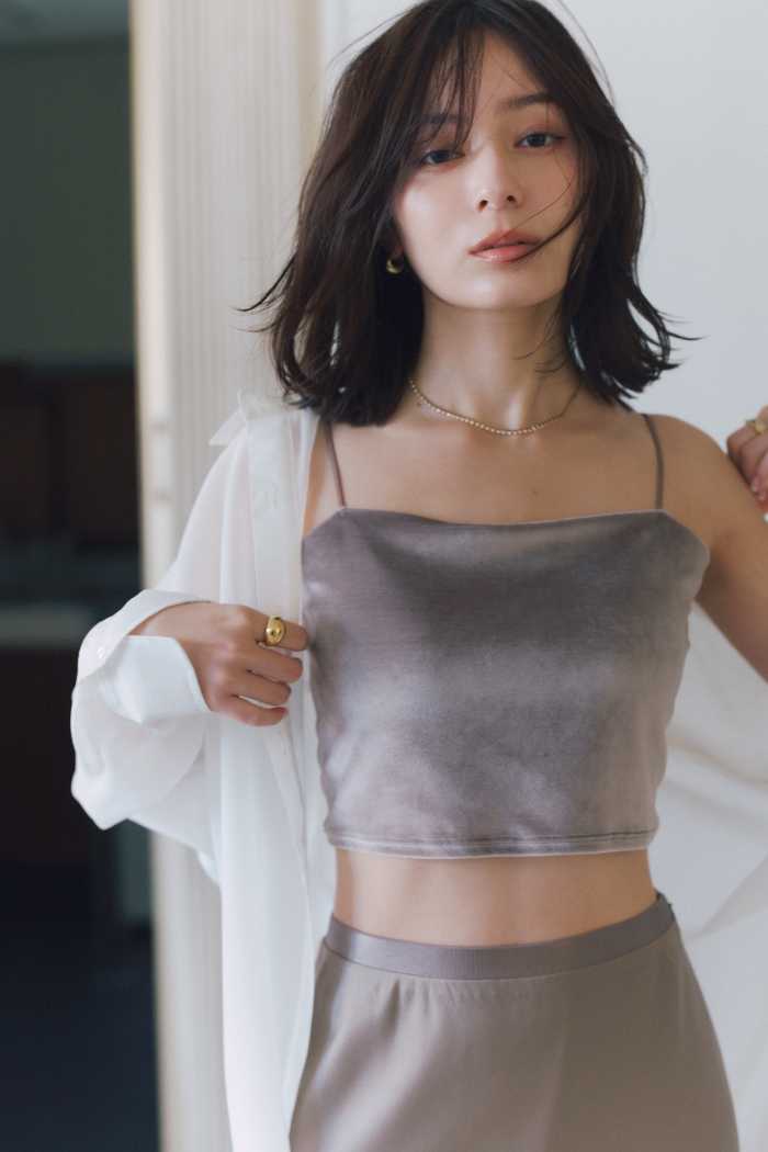 カップインならではの美しいバックオープンラインがポイント。ニュアンスカラーが絶妙で、インでもアウトでも◎