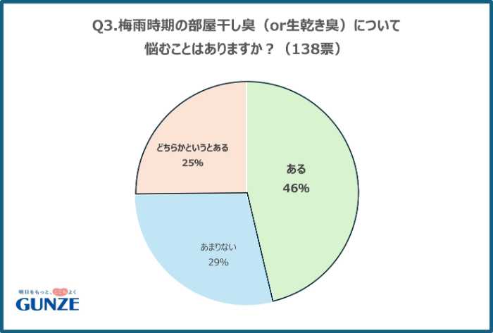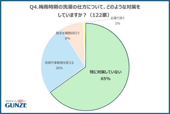 グンゼ公式Xによるフォロワーアンケートでは、「梅雨の悩み」第1位が“洗濯”。約71%が部屋干し臭に悩んでいるにもかかわらず、65%は特別な対策をしていないという結果に。