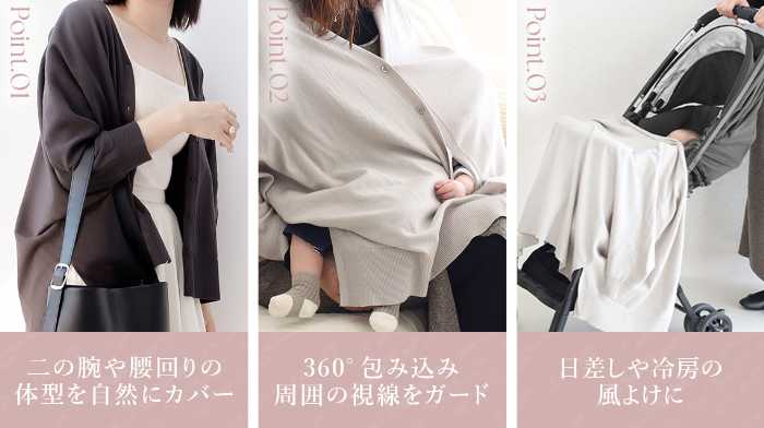 「授乳ケープとしても使えるカーディガン」は、羽織るだけで気になる二の腕や腰回りをカバー。ふわりとした素材で360°包み込めるから、外出先での授乳も周囲の目を気にせず安心です。