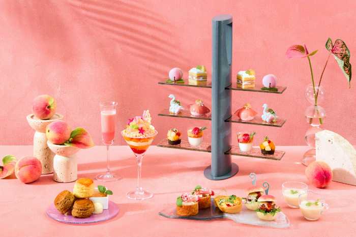 ティースタンドには、「ピーチフロマージュムース」「ピーチタルト」「ピーチマカロン」など、旬の桃を主役にしたスイーツが6種登場。