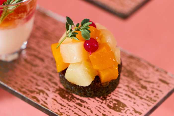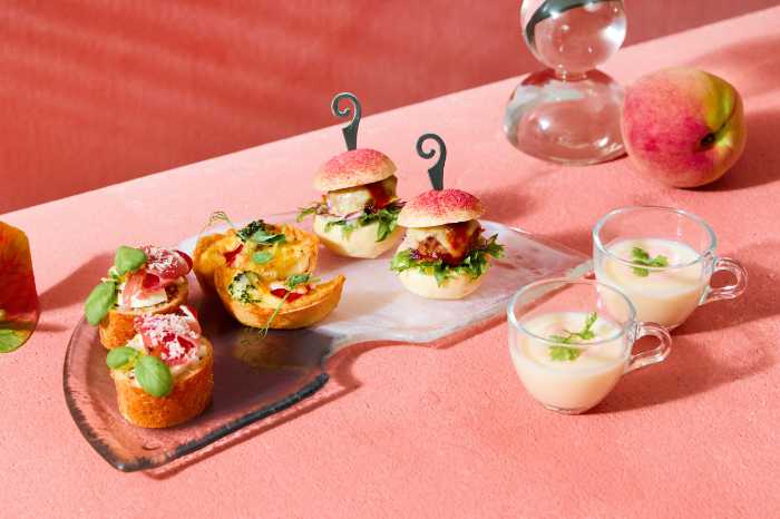 内容:桃のカプレーゼブリュスケッタ/カマンベールチーズとトマトのキッシュ/桃風バンズのハンバーガー/冷製ビシソワーズ(桃風味)