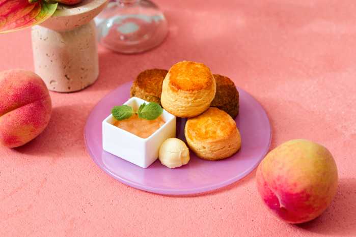 見た目の美しさもさることながら、ラベンダーやアールグレイなどの香りと桃の果汁感が絶妙にマッチ。さらに、白桃入りスコーンや杏仁プリンなど、味わいの変化も楽しめます。