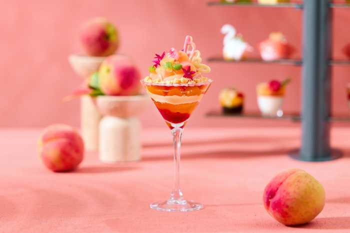 「ピーチ・パルフェ・アフタヌーンティー」は2025年7月18日から8月24日までの約1ヶ月間限定。アートと緑に囲まれた洗練空間「TEA AND BAR」で、夏限定の“桃の楽園”に浸ってみてはいかが?
