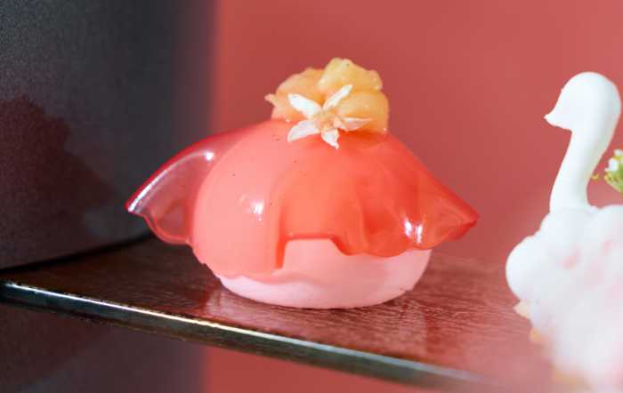 杏仁と2種の桃ゼリーが織りなす爽やかな層仕立て。