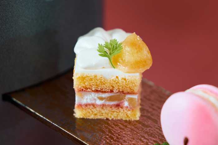 トップの桃の中にはヨーグルトクリームが隠れ、甘さのバランスと食感のアクセントが絶妙です。