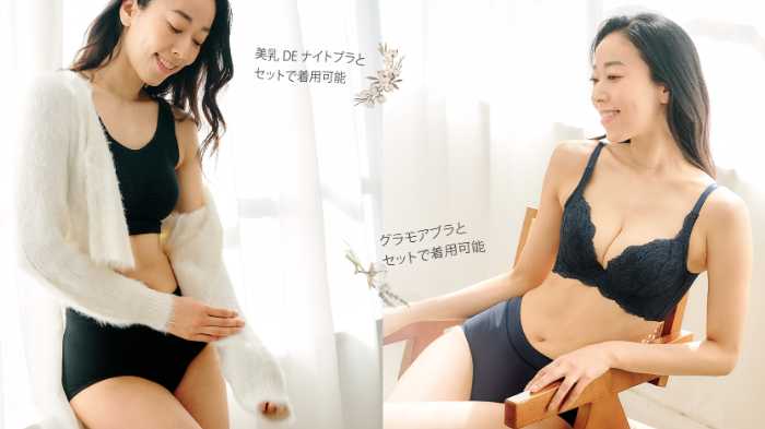 一方で、しっとり柔らかな「インド綿」は、補正ブラ「グラモアブラ」との組み合わせで、美胸×美尻スタイルを実現。