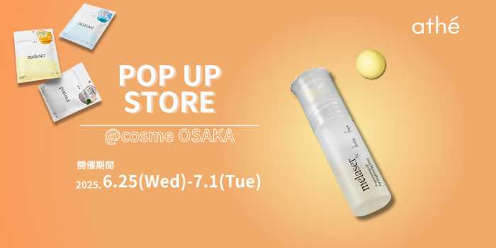 韓国ヴィーガンコスメブランド「athé(アッテ)」が、2025年6月25日(水)〜7月1日(火)の7日間限定で、@cosme OSAKAにてポップアップイベントを開催します。今年ついに日本上陸を果たしたathéのアイテムを実際に手に取って体験できる貴重なチャンス。新作スキンケア「メレーザー プログラミングAP」や、ナチュラルに彩るリップバームなど、ラインアップも充実。自分の肌に合う逸品に出会えるかも♡