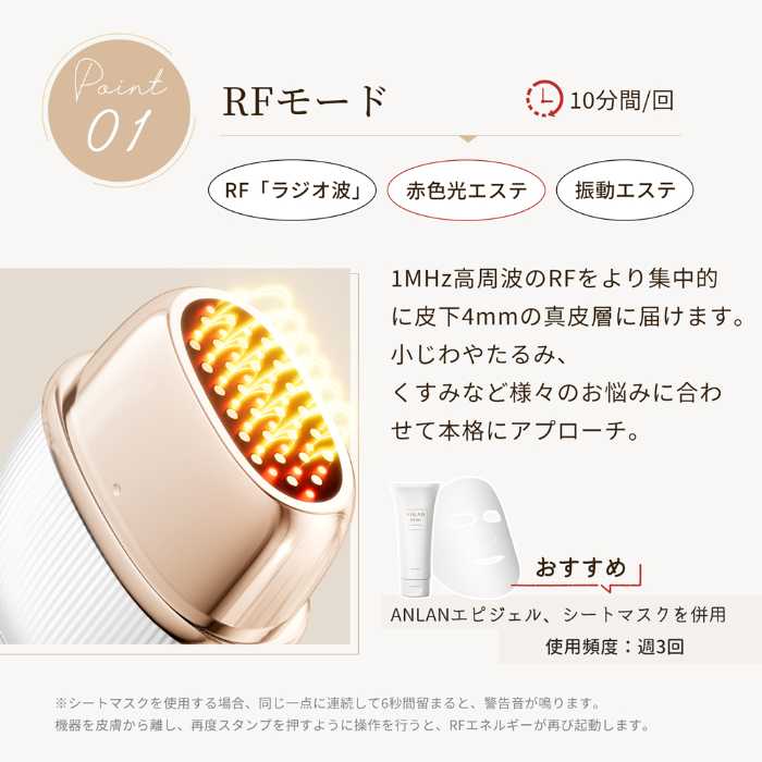 PMRテクノロジーを搭載したRF機能は、1MHzの高周波で肌の角質層までじんわり温め、美容成分の浸透をサポート。