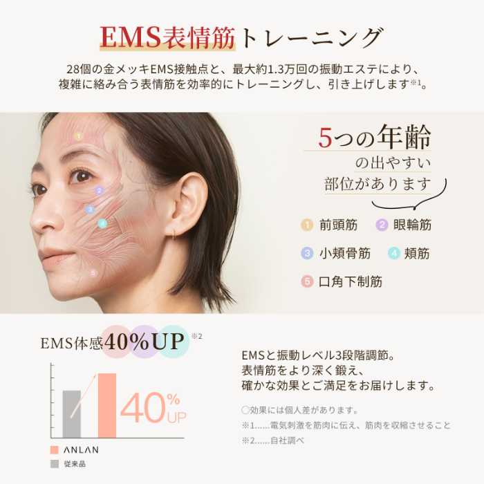 EMSは28個の金メッキ接触点から微電流を出力し、表情筋を効果的にトレーニング。振動エステとの相乗効果で、肌のハリ・弾力感を引き出します。