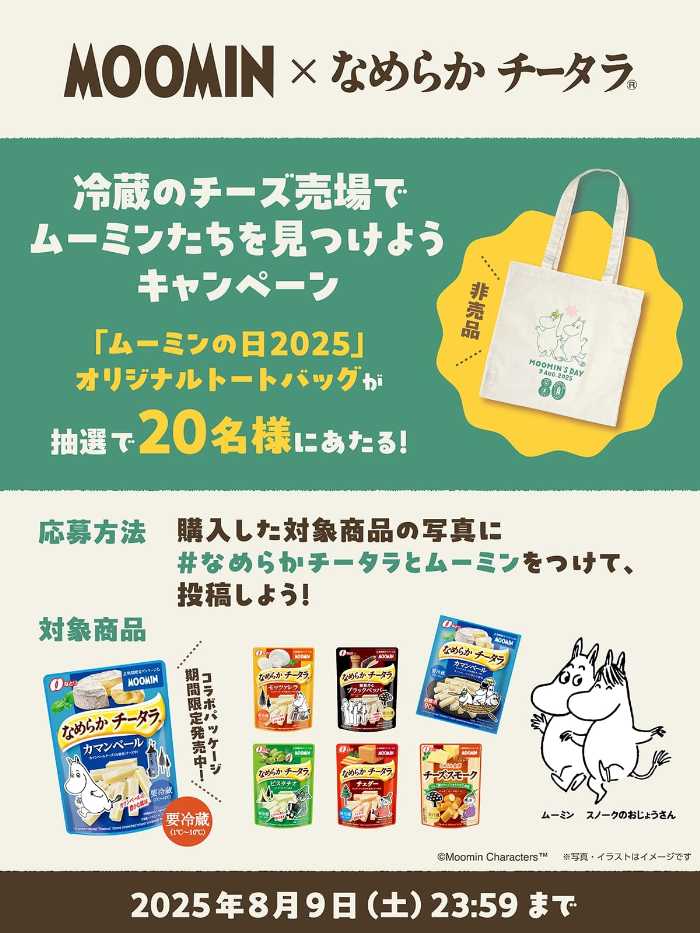 7月26日(土)~8月9日(土)の期間中、対象商品を購入し、「#なめらかチータラとムーミン」をつけてX(旧Twitter)に写真を投稿すると、抽選で20名に「ムーミンの日2025」オリジナルトートバッグが当たります。
