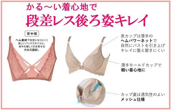 背中の段差を整えるヘム素材&通気性の良いモールドカップで、暑い季節も快適。肌側は吸汗速乾仕様でベタつきにくく、フロントホック&前アジャスターで着脱もラクちん♪