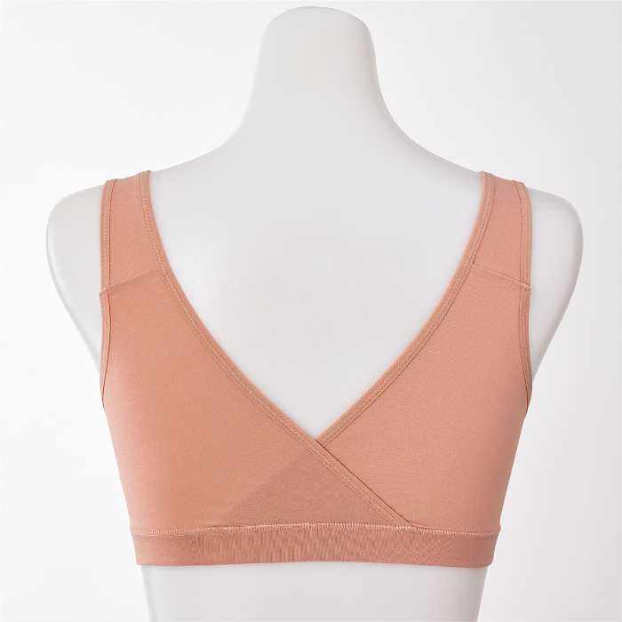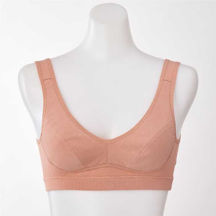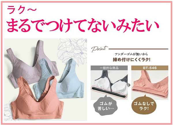 アンダーゴムなし&ノンワイヤーで「まるでノーブラ」のような開放感。クロス仕様の背中で着脱簡単、綿混素材がやさしくフィット。シニア世代やファーストブラにもおすすめ。
