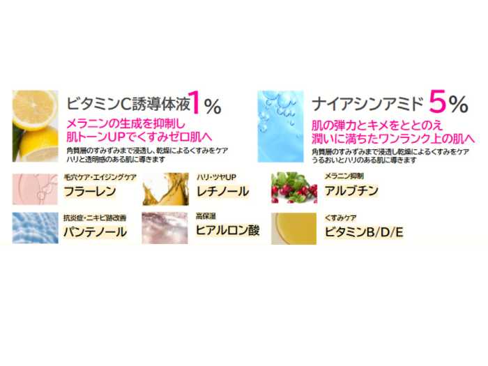 肌のトーンダウンや色ムラ、くすみが気になる方にぴったりの成分で、肌の奥からクリアな透明感を引き出します。