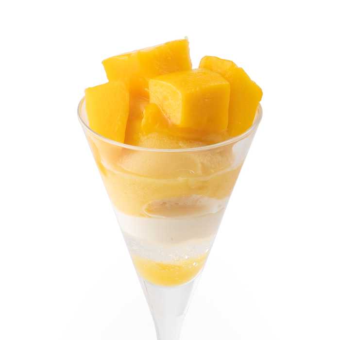 店内で丁寧に作られたマンゴーシャーベットに、マンゴーオレンジソース、コアントローゼリー、ディプロマットクリームを重ねた、爽やかで濃厚な夏のご褒美スイーツです。