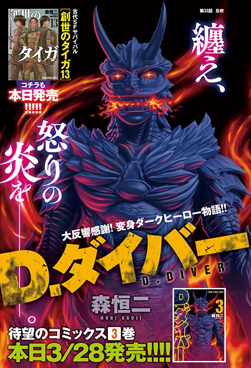 森恒二先生の『D.ダイバー』最新3巻(759円)と『創世のタイガ』13巻(759円)も同日発売!それぞれ壮絶なサバイバル・変身アクションが加速し、見逃せない展開に。