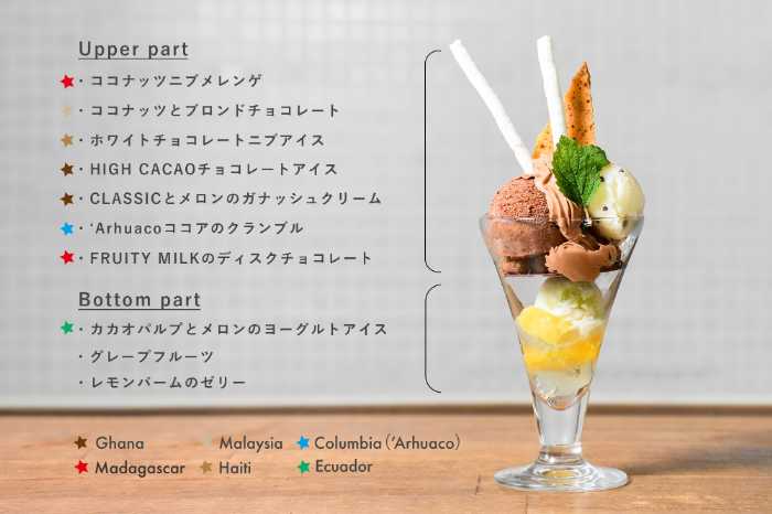 パフェの上層は、6カ国の個性豊かなカカオで構成された8つのチョコレートパーツが贅沢に並びます。