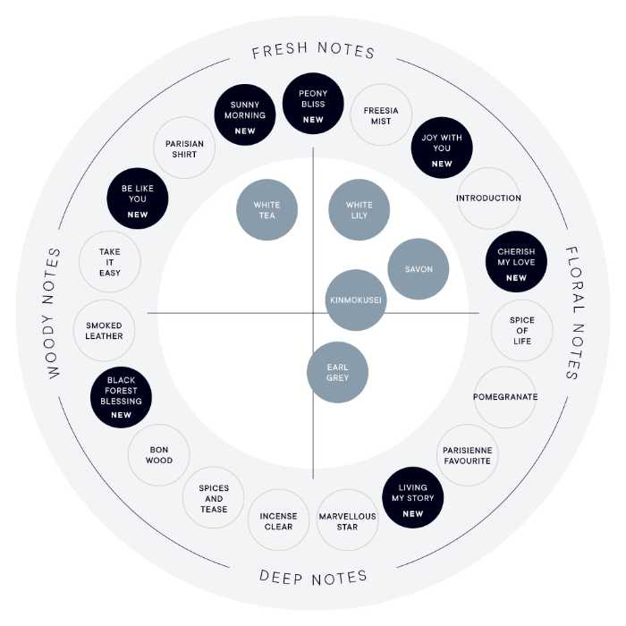 SHIROが独自に設計したチャートでは、香り同士のキャラクターやムードが視覚的にわかりやすく、隣り合う香りは似た雰囲気、対面する香りは対照的な印象を与えてくれます。
