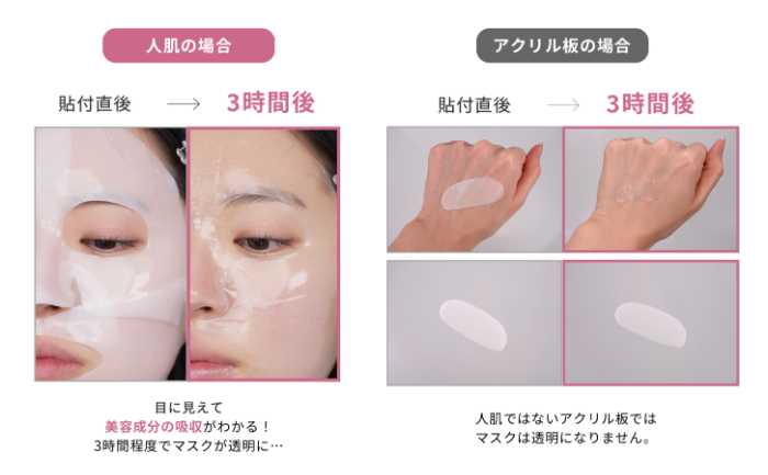 肌にのせると乳白色だったマスクが、3時間かけてじんわり透明に変化。