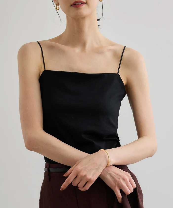 フランス製の繊細なストラップが肩先を華奢に見せ、1枚で着てもインナーとしても美しいバランスに。