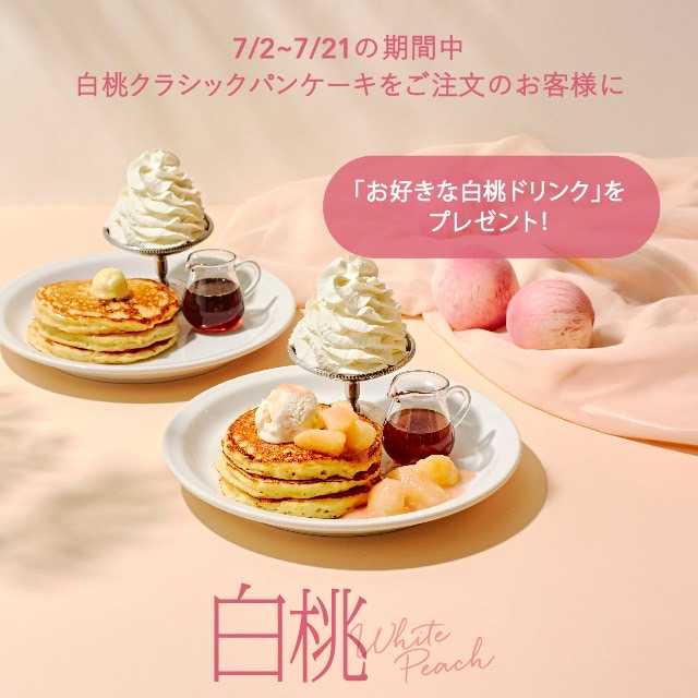 7月2日(水)〜7月21日(月・祝)の期間中に「白桃クラシックパンケーキ」を注文すると、「白桃フルーツティー」または「白桃ティークリームソーダ」のいずれかをプレゼント!